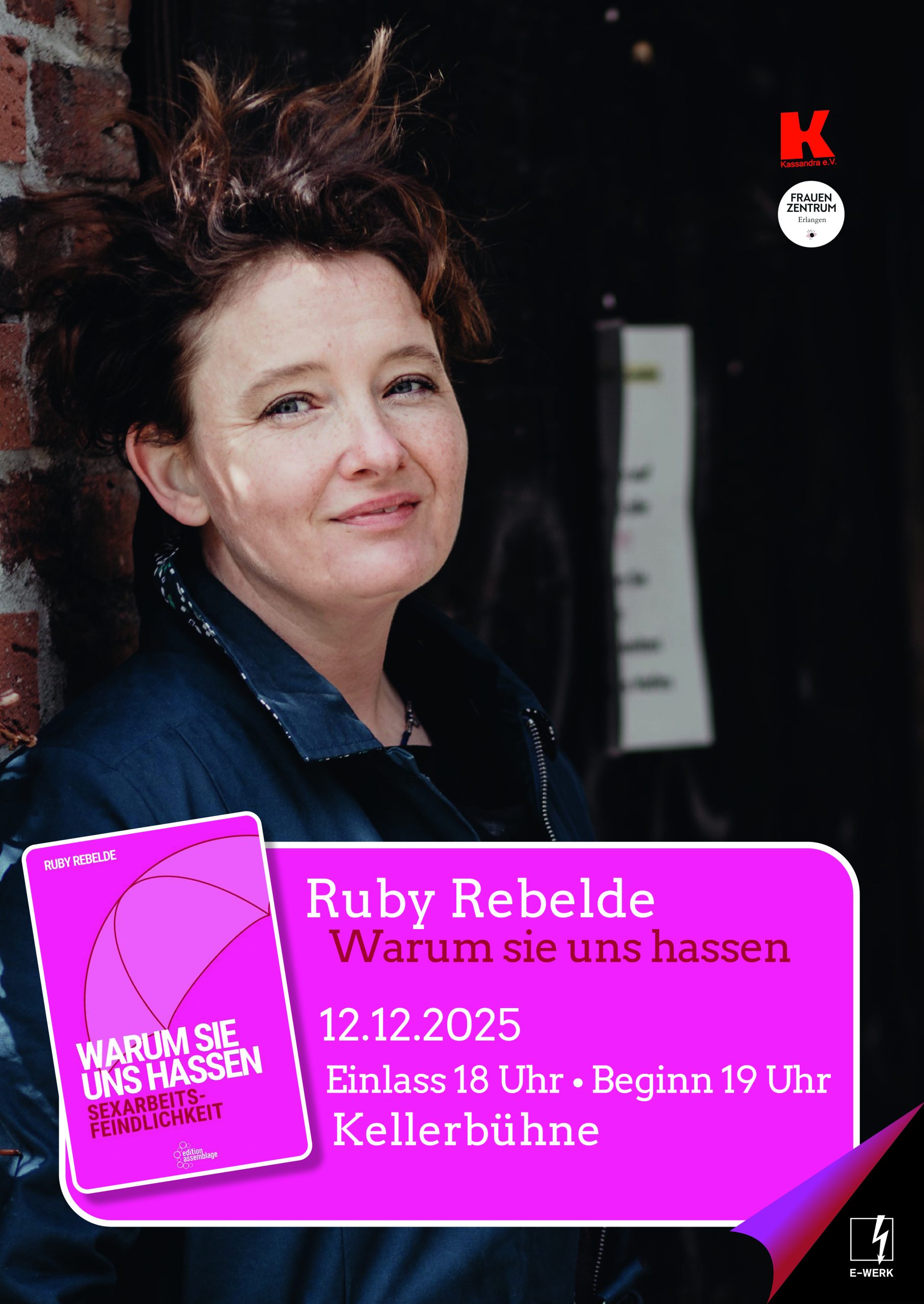 Am Freitag, 12. Dezember, haben wir in Kooperation mit dem Frauenzentrum Erlangen e.V. ein ganz besonderer Schmankerl: Ruby Rebelde liest im E-Werk Erlangen ab 19:00 Uhr aus ihrem Buch „Warum sie uns hassen” zum Thema Sexarbeitsfeindlichkeit. Was bedeutet das eigentlich und was können wir gegen die fortwährende Diskriminierung und Stigmatisierung von Sexarbeitenden tun? Ausgiebige Recherchen laden zum Perspektivenwechsel ein und widmen sich der aktuell stark diskutieren Frage nach Sexarbeit ja/nein/vielleicht…